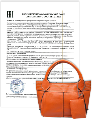 Согласно техрегламентам, сертификация сумок или декларирование обязательная процедура для  продажи большинства детских и взрослых кожгалантерейных товаров. Для того, чтобы получить документ, подтверждающий  законность применения изделий (сертификат или декларацию)  необходимо проверить продукцию на устойчивость окраски, прочность ниточного и сварного швов, наличие вредных химических веществ и предоставить еще немало информации по вопросам, связанным с качеством и безопасностью товара.