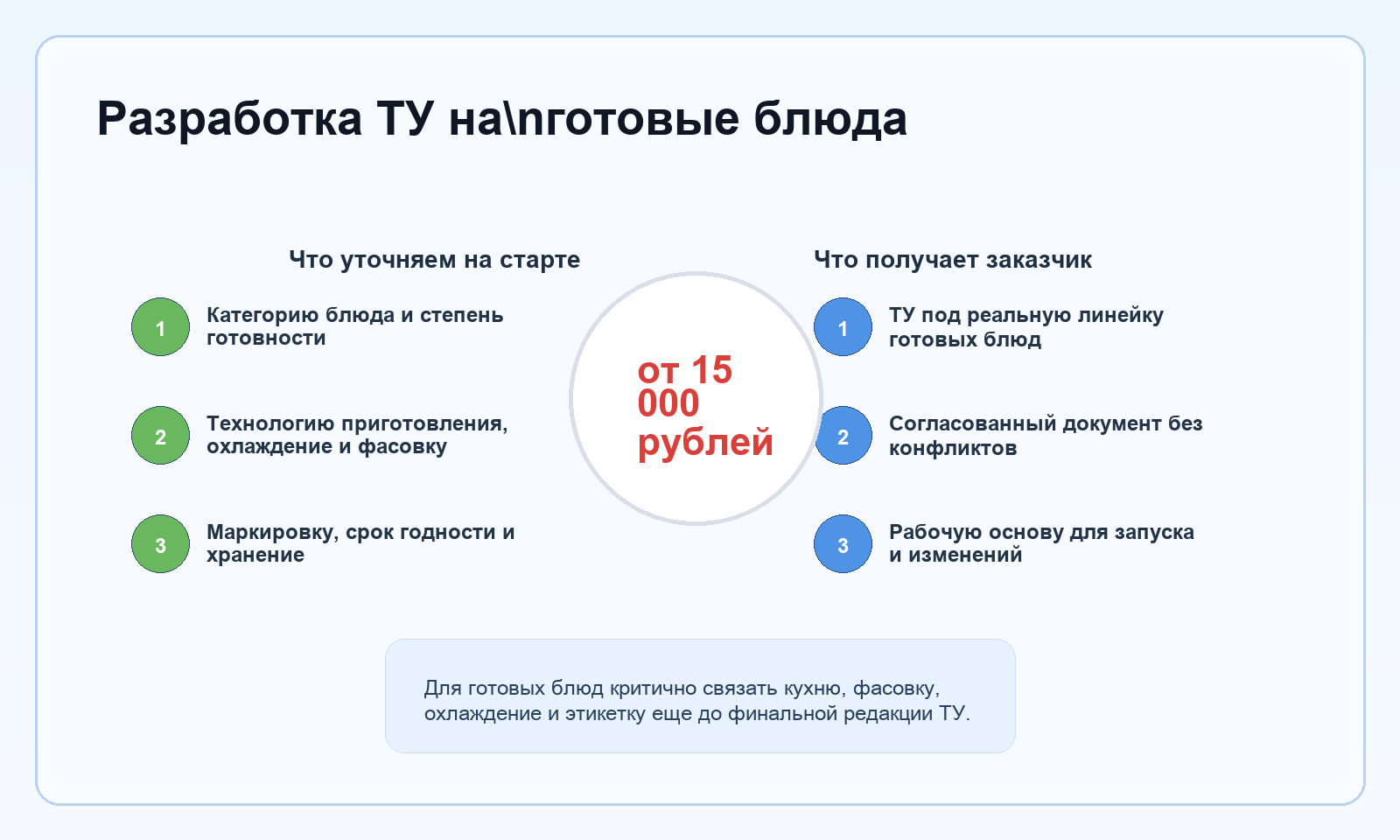 Мы собираем документ не вокруг общего слова `готовые блюда`, а вокруг конкретной производственной схемы. Это значит, что в технических условиях попадают только те вещи, которые реально влияют на выпуск: состав, порция, фасовка, охлаждение, хранение, маркировка.